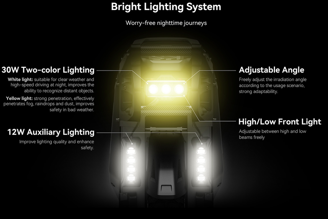 Bei Geschwindigkeiten von bis zu 120 km/h steht Sicherheit an erster Stelle – und der KingSong F18 erfüllt diesen Anspruch bis ins kleinste Detail. Der starke Motor (5000 W / 9000 W Peak) wird von einer fortschrittlichen Elektronik gesteuert, die kontinuierlich Stabilität, Traktion und Leistung überwacht. Die 4 × 5 W Beleuchtung sorgt für hohe Sichtbarkeit und Helligkeit, während der einstellbare Leuchtwinkel auch bei schneller Fahrt eine bessere Übersicht über die Fahrbahn ermöglicht. Die breiten 2.75-14-Reifen tragen zur Stabilität bei hohen Geschwindigkeiten und in schärferen Kurven bei, während die Federung mit 100 mm Federweg Stöße effektiv absorbiert, sodass der Fahrer auch auf unebenem Untergrund die Kontrolle behält. Die Konstruktion aus Magnesiumlegierung erhöht die Festigkeit und Widerstandsfähigkeit des gesamten Gehäuses, während eine Traglast von 140 kg auch bei höherer Belastung eine sichere Handhabung ermöglicht. Dank einer Steigfähigkeit von bis zu 45° meistert der F18 auch sehr steile Anstiege ohne unnötige Belastung des Motors. Diese Eigenschaften sorgen gemeinsam für ein stabiles und sicheres Fahrerlebnis, das insbesondere bei hoher Leistung und Geschwindigkeit entscheidend ist.