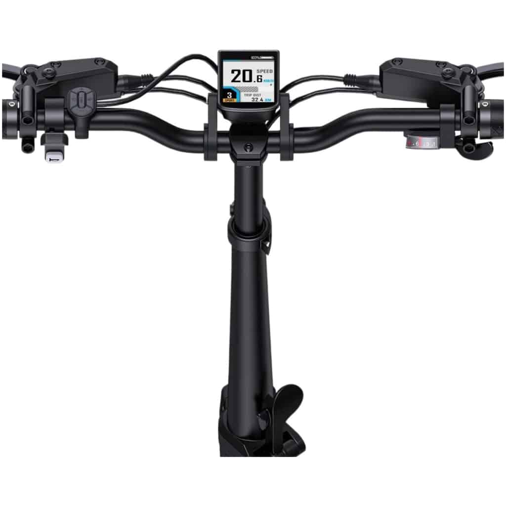 Das Modell Engwe Engine Pro 2.0 setzt auf eine intelligent konzipierte Faltkonstruktion, die ein schnelles Zusammenklappen auf die Maße 104 × 55 × 84 cm ermöglicht – ideal für den Transport im Kofferraum, in öffentlichen Verkehrsmitteln oder zur Aufbewahrung in der Wohnung. Der Rahmen aus einer leichten, aber stabilen 6061-Aluminiumlegierung sorgt für hohe Stabilität, während das Design sportlichen Stil mit funktionaler Ergonomie verbindet. Die Fat-Reifen 20 × 4.0″ bieten hervorragenden Grip auf Asphalt, Schotter und Schnee und machen dieses Modell wirklich universell einsetzbar. Die hydraulischen Scheibenbremsen mit 160 mm Durchmesser sorgen für präzises und gleichmäßiges Bremsen auch bei schlechteren Bedingungen. Selbstverständlich verfügt das Fahrrad über Vollfederung – Federgabel vorne und Dämpfer hinten, was den Fahrkomfort auf unebenen Wegen deutlich erhöht. Neu ist das verbesserte LCD-Display, das übersichtlich Geschwindigkeit, Akkustand, Unterstützungsmodus und weitere Daten in Echtzeit anzeigt. Das vordere LED-Licht und das hintere Bremslicht erhöhen die Sicherheit bei Nachtfahrten. Ein praktischer Vorteil ist auch das Shimano Altus 8-Gang-System, das sanftes Schalten je nach Gelände ermöglicht. Dieses Fahrrad denkt einfach an jedes Detail – vom robusten Rahmen bis zum ergonomischen, stoßdämpfenden Sattel.