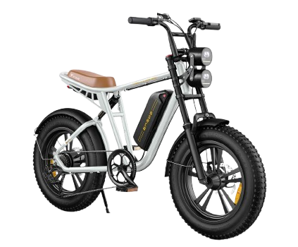 Das Design des ENGWE M20 zählt zu seinen größten Stärken. Es kombiniert eine retro-inspirierte Motorradoptik mit modernen E-Bike-Technologien und einer robusten Rahmenkonstruktion. Der Rahmen besteht aus einer widerstandsfähigen 6061-Aluminiumlegierung, die hohen Belastungen, Stößen und langfristigem Einsatz unter verschiedenen Bedingungen standhält. Während viele urbane E-Bikes auf ein minimalistisches und leichtes Design setzen, legt das M20 den Fokus auf Stabilität, Solidität und einen ausgeprägten Motorradcharakter. Die Abmessungen des Fahrrads betragen 167 cm Länge, 114 cm Höhe, 37 cm Reach, 115,2 cm Radstand und 76,2 cm Rahmenhöhe, was eine komfortable Sitzposition für die meisten Fahrer gewährleistet. Ein großes Highlight ist die Möglichkeit, einen zweiten Akku zu montieren, der im Rahmen integriert wird und dem Bike einen noch markanteren Moto-Look verleiht. Zur hochwertigen Ausstattung gehören eine vordere hydraulische Federgabel in Kombination mit hinteren Luftdämpfern, wodurch das E-Bike vollgefedert ist und sich auch für unebene Straßen eignet. Ein starkes vorderes LED-Licht sorgt für gute Sichtverhältnisse, die 20×4.0" Fat-Reifen bieten hervorragende Traktion und Fahrstabilität, während die mechanischen 160-mm-Scheibenbremsen vorne und hinten zuverlässige Bremsleistung garantieren. Ein weiterer Vorteil ist die 7-Gang-Schaltung, die eine flexible Anpassung des Fahrstils an unterschiedliche Bedingungen ermöglicht.