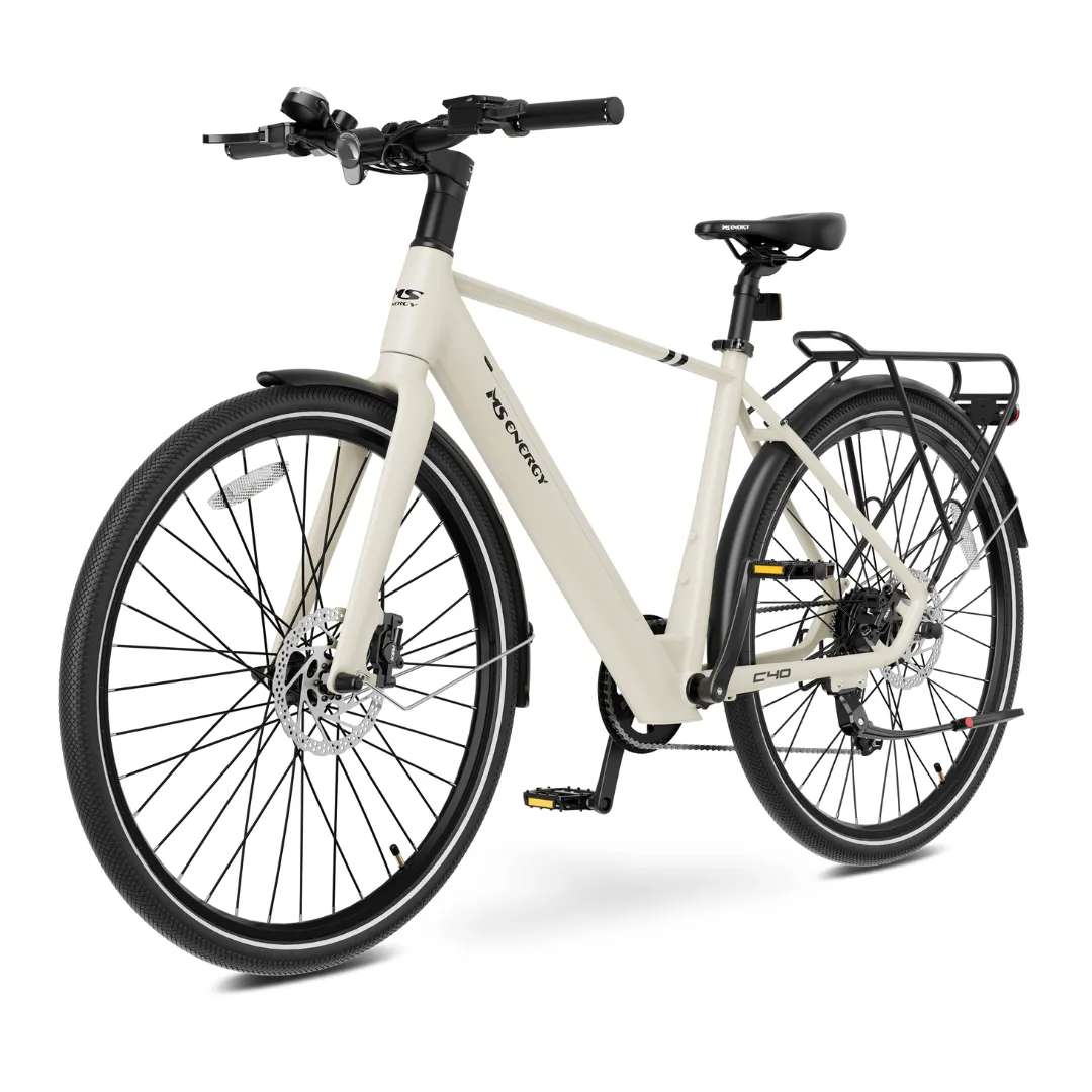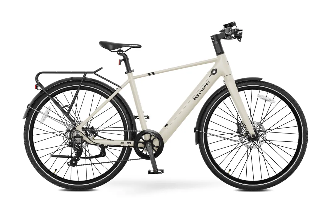 Modernes städtisches Elektrofahrrad MS ENERGY C40 (2025) mit 250 W Motor, bis zu 60 km Reichweite, hydraulischen Bremsen, leichtem 21 kg Aluminiumrahmen und integrierter 36 V/10 Ah Batterie für komfortables und sicheres Fahren.