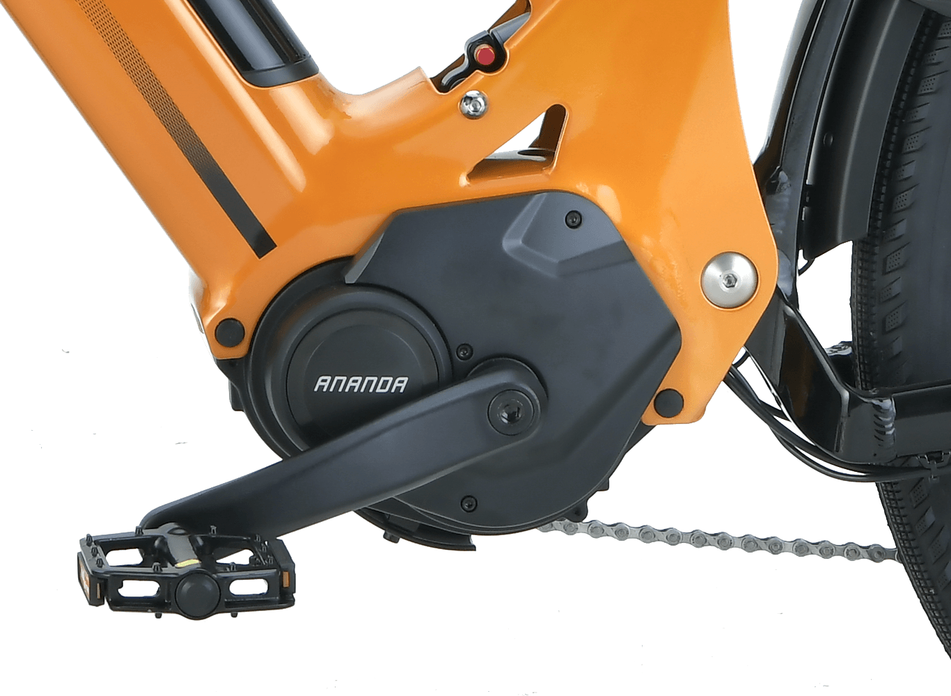 Das Herzstück des Fahrrads ist der Mittelmotor Ananda M60 mit einer Nennleistung von 250 W und einem Drehmoment von 70 Nm, der genügend Kraft auch für steile Anstiege bis zu 20 % bietet. Der Motor ist für einen reibungslosen Betrieb optimiert und sorgt zusammen mit dem Drehmomentsensor für ein natürliches Fahrgefühl – je stärker der Fahrer tritt, desto mehr Unterstützung liefert der Motor. Der 48 V / 12 Ah Akku ist vollständig im Rahmen integriert, was sowohl die Optik als auch den Schutz vor Witterungseinflüssen verbessert. Im Eco-Modus lässt sich eine Reichweite von bis zu 120 km erzielen, im Maximalmodus ca. 70–80 km. Das vollständige Aufladen dauert 4–6 Stunden, sodass das Fahrrad ohne lange Wartezeiten für den täglichen Gebrauch bereitsteht. Die Höchstgeschwindigkeit ist auf 25 km/h begrenzt, womit das Modell zu den in der EU legal nutzbaren E-Bikes gehört.
