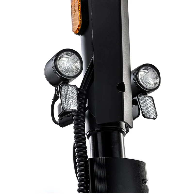 Bei einer Geschwindigkeit von bis zu 72 km/h und einer Leistung von 7200 W ist Sicherheit von größter Bedeutung. Der MIA Four X4 kombiniert daher mechanische Stabilität mit elektronischem Schutz. Der steife Rahmen mit niedrigem Schwerpunkt und breiter Standfläche reduziert das Risiko eines Umkippens, während die hydraulischen Bremsen und die unabhängige Federung einen konstanten Kontakt der Räder mit der Oberfläche auch bei starkem Bremsen gewährleisten. Der Scooter ist mit vorderer und hinterer LED-Beleuchtung, Blinkern und Bremslicht ausgestattet, um die Sichtbarkeit bei Nacht zu verbessern. Die Elektronik umfasst Schutz vor Überhitzung, Tiefentladung und Kurzschluss der Batterie. Das Leistungsmanagementsystem begrenzt automatisch die Beschleunigung, wenn die Sensoren einen gefährlichen Neigungswinkel erkennen. Die 14,5-Zoll-Reifen bieten hohen Grip, während die Gesamtbreite (689 mm) für einen stabilen Stand sorgt. Mit einer maximalen Traglast von 150 kg ist der Scooter für die meisten erwachsenen Fahrer geeignet, ohne den Komfort zu beeinträchtigen. Sicherheitsmerkmale werden durch reflektierende Elemente und eine automatische Motorabschaltung beim Betätigen des Bremshebels ergänzt – ein Standard in der Premiumklasse elektrischer Fahrzeuge.