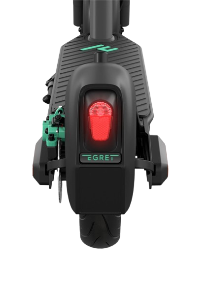Sicherheit beim Fahren ist einer der wichtigsten Pfeiler, auf denen der Egret Ey! 6 seine Identität aufbaut. Die Basis bildet das kombinierte Bremssystem, das aus einer vorderen Trommelbremse, einer hinteren Scheibenbremse und einer elektronischen Rekuperationsbremse besteht. Diese Verbindung sorgt für einen deutlich kürzeren Bremsweg und hohe Kontrolle auch in anspruchsvolleren Situationen. Der Fahrer kann sich darauf verlassen, dass der Roller schnell und intuitiv reagiert – ohne Verzögerung oder Stabilitätsverlust. Die Rekuperation schont zudem die hintere mechanische Bremse und verlängert ihre Lebensdauer. Sichtbarkeit ist ein weiterer entscheidender Sicherheitsfaktor. Der Egret Ey! 6 verfügt über ein 700-Lumen-Front-LED-Licht, das den Weg auch bei völliger Dunkelheit ausleuchtet, sowie ein markantes Rück-LED-Licht mit Bremsindikator. Ein echter Vorteil sind jedoch die integrierten Blinker an den Lenkern – ihre Position liegt natürlich im Sichtfeld anderer Verkehrsteilnehmer, was die Sicherheit beim Abbiegen deutlich erhöht. Die Konstruktion des Rollers ist fest und stabil, was in Kombination mit hochwertigen 10" schlauchlosen Reifen für hervorragende Traktion sorgt. Die Wasserbeständigkeit – IPX5 für den Körper und IP67 für den Akku – garantiert einen sicheren Betrieb auch bei Regen. Mit einer Traglast von bis zu 120 kg bleibt der Roller auch bei höherer Belastung stabil und gut kontrollierbar. Der Egret Ey! 6 ist schlicht ein Modell, das die Sicherheit des Fahrers an erste Stelle setzt.