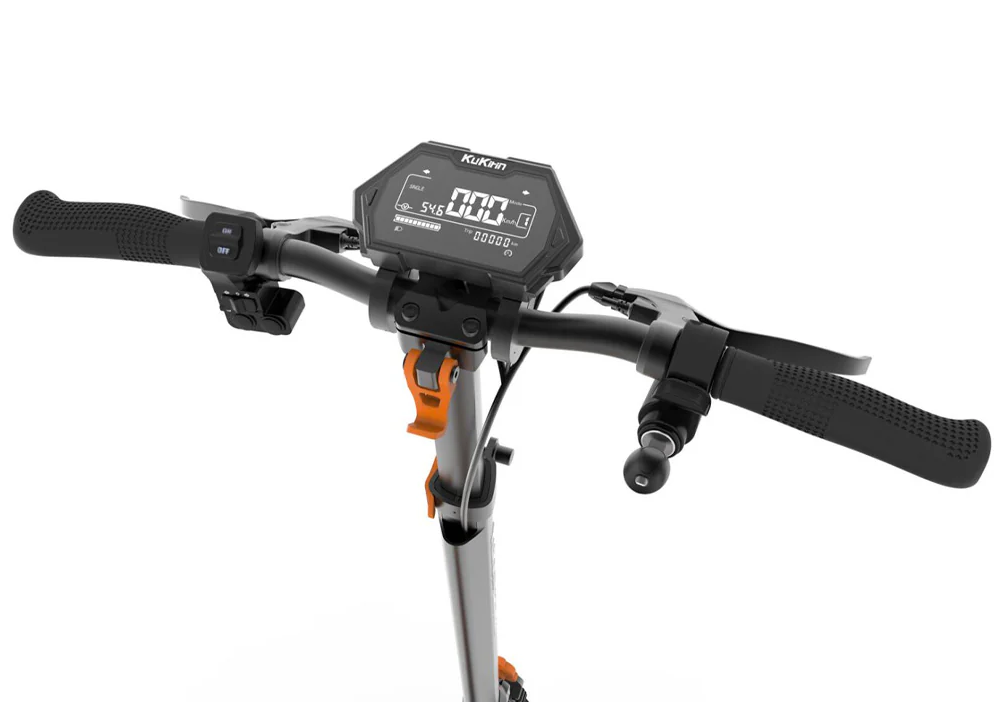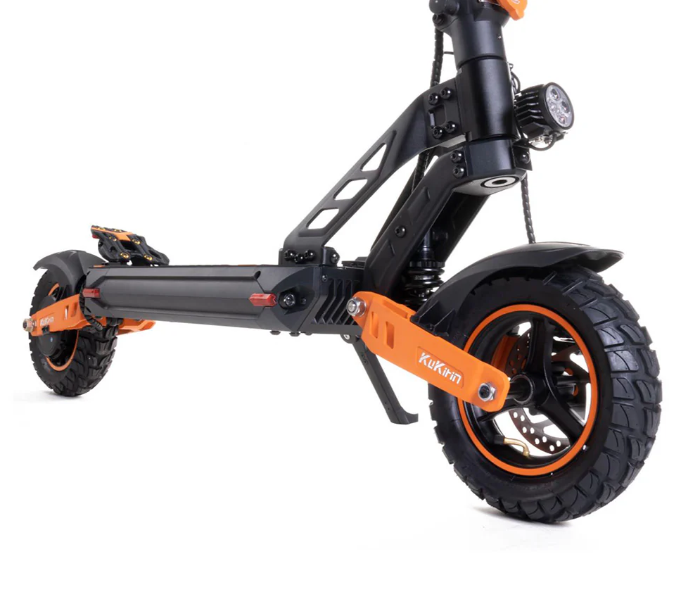 Der KuKirin G2 Max beeindruckt auf den ersten Blick durch sein modernes sportliches Design, das eine robuste Bauweise mit eleganten Linien kombiniert. Dank des hochwertigen Rahmens ist der Roller nicht nur optisch ansprechend, sondern auch äußerst widerstandsfähig gegenüber täglichem Gebrauch. Die Abmessungen im ausgeklappten Zustand betragen 1260 × 605 × 1300 mm, im zusammengeklappten Zustand 1260 × 605 × 580 mm, was die Lagerung und den Transport erleichtert. Mit einem Gewicht von ca. 31 kg bietet er Stabilität und Festigkeit, bleibt dabei aber leicht handhabbar. Der Komfort beim Fahren wird durch ein Vierarm-Federungssystem in Kombination mit 10-Zoll-Offroad-Reifen gewährleistet, die verschleiß- und stoßfest sind. Der KuKirin G2 Max verfügt über einen abnehmbaren Sitz, der zusätzlichen Komfort auf längeren Fahrten bietet. Das sechspunktige Beleuchtungssystem umfasst
